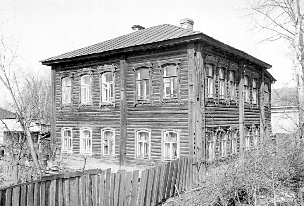 Двухэтажный дом характерен для деревянной застройки Галича периода эклектики, в которой сохраняются отдельные декоративные элементы позднего классицизма. Возможно, его объем и венчающий карниз относятся к сер. — 3-й четв. XIX в., а основной резной декор добавлен в конце столетия. Стены рублены с остатком и обшиты тесом, цоколь — кирпичный. Прямоугольный в плане дом-пятистенок завершен вальмовой кровлей. Сбоку на всю ширину к нему примыкают чуть более низкие сени под односкатной крышей. Главный и боковой фасады разделены перерубами на две части каждый — в две и три оси окон. Выступы перерубов и угловых венцов оформлены филенчатыми лопатками. Все окна имеют лучковые перемычки. Наличники с нарядной пропильной резьбой на главном фасаде оформляют окна обоих этажей, на боковом — только второго этажа. Сильно выступающий венчающий карниз украшен мутулами и резными розетками. Во входном проеме, расположенном сбоку со стороны улицы, сохранилась двустворчатая филенчатая дверь. Лит. и ист.: Памятники архитектуры Костромской области. Вып. 3. Кострома, 2001. С. 26-27.