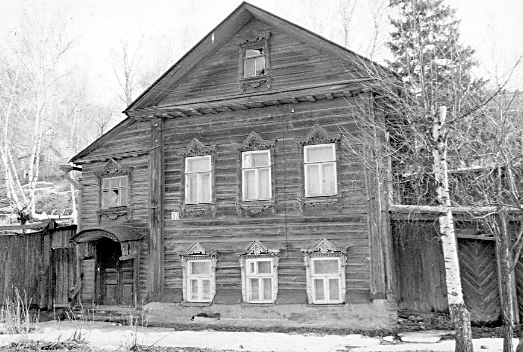 Дом жилой, сер. XIX в., кон. XIX в.Адрес Рубленный с остатком дом имеет прямоугольный в плане вытянутый в глубину участка и обшитый тесом объем под двускатной кровлей. На всю его длину примыкают более низкие, но также двухэтажные, сени с односкатной кровлей. Главный фасад основного объема имеет строго симметричную композицию в три оси окон, завершенную треугольным фронтоном. Выступы угловых венцов оформлены филенчатыми лопатками с накладными ромбами. Окна (почти квадратные на первом этаже и более высокие на втором) до недавнего времени были обрамлены наличниками со щипцовыми сандриками и украшены нарядной пропильной резьбой, а верхние окна дополнены фартуками в виде стилизованных солярных знаков. Аналогичное оформление имело чердачное окно в тимпане фронтона. В настоящее время наличники окон второго этажа утрачены, оконные проемы на главном фасаде расширены и получили новое заполнение с расстекловкой, не соответствующей исторической, а окно на боковом фасаде зашито. Профилированный венчающий карниз с мутулами четко отделяет основную плоскость стены от фронтона. Парадный вход сеней и широкое окно над ним создают дополнительный боковой акцент в композиции главного фасада. Над двустворчатой филенчатой дверью был устроен крупный деревянный навес с лучковым завершением, украшенный ажурной резьбой, ныне он утрачен. Карниз сеней, как и основной объем, подчеркнут мутулами. Лит. и ист.: Памятники архитектуры Костромской области. Вып. 3. Кострома, 2001. С. 28-29. Данные государственной охраны