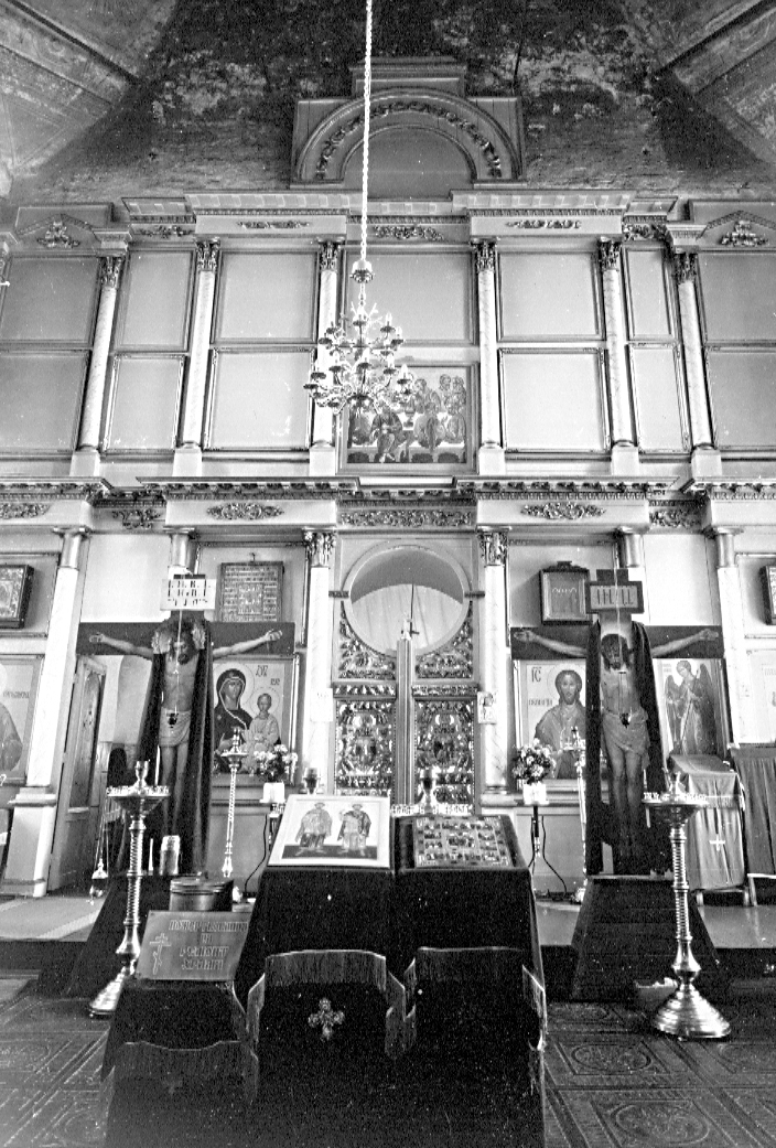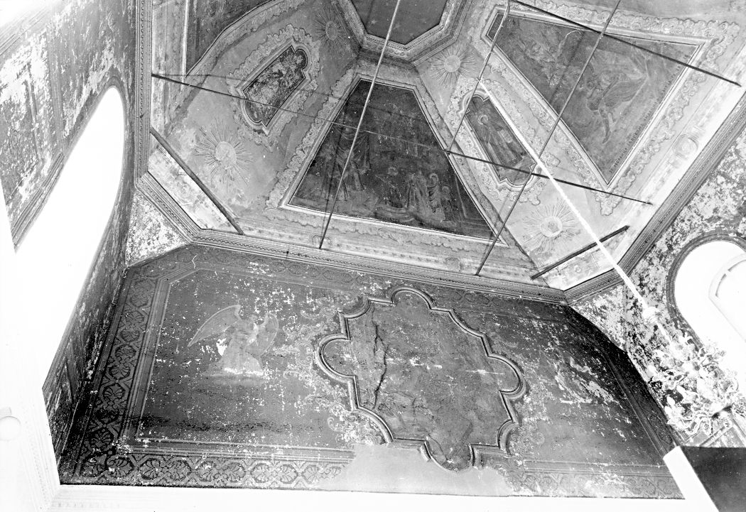 Церковь Козьмы и Дамиана, сер. XVIII в., 1-я треть XIX в.Адрес Церковь, стоящая на высоком холме над железной дорогой, видна со многих улиц западной части города и играет большую роль в формировании его панорамы. Вокруг храма расположено старое, заросшее деревьями кладбище. Компактный кубовидный двусветный четверик храма завершен высокой кровлей гуськового очертания и увенчан миниатюрной чешуйчатой главкой, поднятой над шлемовидной кровлей восьмигранного барабана. Пониженная полуциркульная апсида и широкая трапезная, придельные алтари которой частично прикрывают основной объем, равны по высоте. С запада устроен небольшой притвор с купольной кровлей. Храм окружен профилированным цоколем. Углы четверика подчеркнуты широкими огибающими лопатками, а венчает его профилированный карниз с поясом мелких двухступенчатых консолек. Окна боковых фасадов, размещенные по двум осям, оформлены вдавленными ступенчатыми рамками, которые в верхнем ярусе завершены килевидными кокошниками, а в нижнем — дополнены колончатыми наличниками с разорванными фронтонами в духе нарышкинского барокко. Стены апсиды и трапезной венчают простые ступенчатые карнизы. Окна придельных алтарей в профилированных рамках с треугольными фронтончиками, по-видимому, относятся к первоначальному периоду строительства, а тройные итальянские окна на боковых фасадах — результат перестроек XIX в. Аналогичные тройные окна украшают также боковые фасады западного притвора. Храмовый четверик перекрыт восьмилотковым сводом с восьмигранным отверстием светового барабана в шелыге. Узкие диагональные грани опираются на плоские тромпы. Три арки ведут в алтарь, конха которого прорезана тремя распалубками над окнами. Трапезная перекрыта поперечным лотковым сводом с распалубками над окнами; в притворе — плоский потолок. Внутри в основании свода и под окнами второго света проходят профилированные карнизы с сухариками. Верхний ярус стен и свод четверика украшены живописью. В своде она относится к 1-й пол. XIX в. и интересна как пример живучести барочных традиций в росписях провинции. На основных гранях в поздних тянутых обрамлениях помещены многофигурные композиции на библейские темы, на диагональных — святые в рост, под ними в сияниях — символы веры. Общий колорит росписей теплый, высветленный, построенный на сочетании бледно-зеленого фона стен, охристых тонов в рокайльных орнаментах и оливково-зеленоватых в сюжетных композициях. Плохо сохранившаяся живопись на боковых стенах (евангелисты) сильно прописана маслом, а роспись западной стены с сюжетной сценой в профилированном тянутом квадрифолии и фигурами ангелов по сторонам появилась в нач. XX в. Главный иконостас, голубой, с позолоченными деталями и колоннами, выкрашенными «под мрамор», перевезен из церкви Рождества Богоматери в с. Реброво Галичского района. Он выполнен в 1820-1830-е гг. в стиле классицизма. Два яруса стройных колонн с коринфскими капителями несут неполные антаблементы с гладким фризом и профилированным карнизом, декорированным мутулами и резными розетками. Раскреповки антаблементов образуют подобия двухколонных портиков. Царские врата украшены гирляндами из виноградных гроздьев. В храме сохранилось покрытие из чугунных плит с изображением букетов в круглой рамке. Лит. и ист.: Ратшин А. Полное собрани