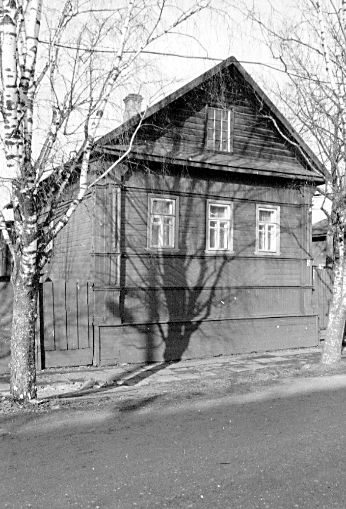 Пример типичного для городских окраин скромного мещанского дома, построенного по типу традиционной сельской избы-пятистенка. Вероятно, дом был срублен во 2-й пол. XIX в., а в нач. XX в. получил новую обшивку. Прямоугольный в плане одноэтажный объем, поднятый на подклете и обращенный к улице трехоконным южным фасадом, крыт на два ската. К боковому восточному фасаду до недавнего времени примыкала пониженная пристройка сеней, замененная в настоящее время новым, более высоким объемом. Четыре профилированные полочки (в завершении цоколя, под окнами, посередине широкого подоконного пояса и над окнами — в основании широкого фриза под кровлей) разделяют участки стен с разной обшивкой — горизонтальной, вертикальной и диагональной. Те же полочки перерезают угловые филенчатые лопатки с вытянутыми накладками и подобием капителей в виде ушек с вертикальными прорезями. В треугольном фронтоне помещено прямоугольное окно с мелкой расстекловкой. Оконные проемы основного объема в 2000-х гг. получили современное заполнение с расстекловкой, не соответствующей исторической. Лит. и ист.: Памятники архитектуры Костромской области. Вып. 3. Кострома, 2001. С. 39.