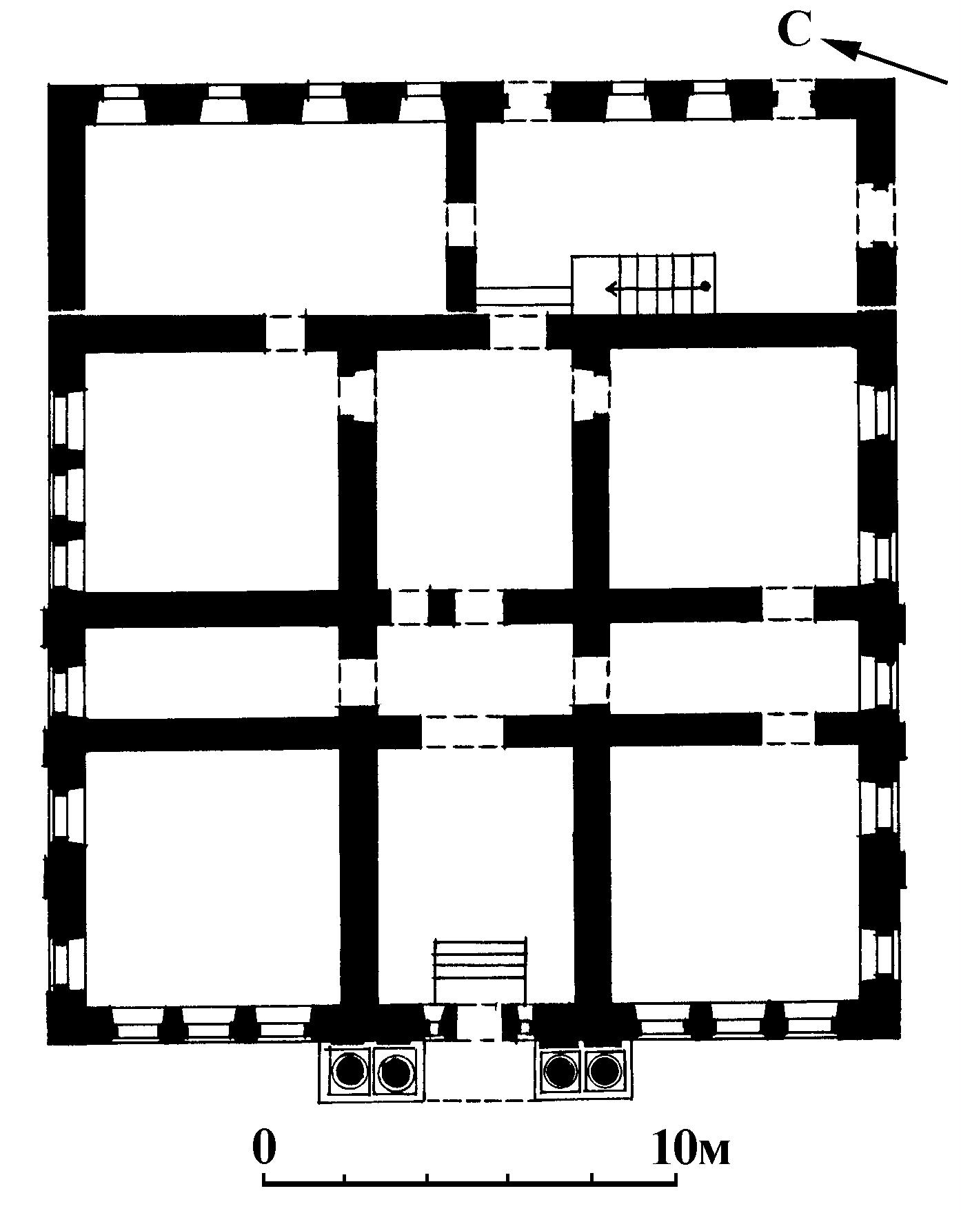 Дом жилой, нач. XIX в., кон. XIX - нач. ХХ в.Адрес Двухэтажное с мезонином здание выстроено из кирпича и оштукатурено. Почти квадратный в плане объем завершен вальмовой кровлей. На поперечной оси первоначального корпуса возвышается мезонин. Здание отличается развитой композицией и выразительным декором. Главный фасад в девять осей проемов в средней части акцентирован двумя парами тосканских колонн колоссального ордера. На них опирается выступ глубокой арочной лоджии мезонина. Между парами колонн проемы первого и второго этажей сгруппированы по схеме итальянского окна. В центре расположен главный вход в дом. Стена расчленена двумя междуэтажными полками, которые прерываются только пилястрами, соответствующими колоннам. На флангах нижний этаж обработан рустом, а окна отмечены высокими клинчатыми замками. Углы фасада закреплены крупным рустом «в перебежку». В завершении стены проходит широкий фриз, украшенный по осям окон нишками — круглыми и ромбовидными. В мезонине по сторонам лоджии расположены прямоугольные окна с сандриками на кронштейнах. Во фризе мезонина помещены чередующиеся круглые и ромбовидные нишки, завершается мезонин ступенчатым аттиком с круглым чердачным окошком в центре. Боковые фасады (первоначальная композиция в пять осей окон) имеют аналогичные главному фасаду горизонтальные членения и близкий ему декор. Средняя часть выделена четырьмя тосканскими пилястрами колоссального ордера. Первоначально над ними возвышался аттик с треугольным фронтоном и вогнутыми боковыми стенками. Аттик был прорезан полукруглым трехчастным окном. На заднем фасаде мезонина применена та же композиция, что и со стороны площади, но вместо арочной лоджии здесь устроено полукруглое итальянское окно. Внутренняя планировка образована капитальными стенами. На поперечной оси первоначального здания расположены сени. На первом этаже на продольной оси устроен коридор. По сторонам сеней и коридора, до недавнего времени сохранявших элементы убранства кон. XIX в. — филенчатые двери в формах эклектики и решетку междуэтажной лестницы, — расположены основные помещения. На втором этаже уцелел один из первоначальных арочных проемов. Лит. и ист.: Тиц А.А. На земле древнего Галича. М., 1971. С. 38; Памятники архитектуры Костромской области. Вып. 3. Кострома, 2001. С. 69-70. Персоны