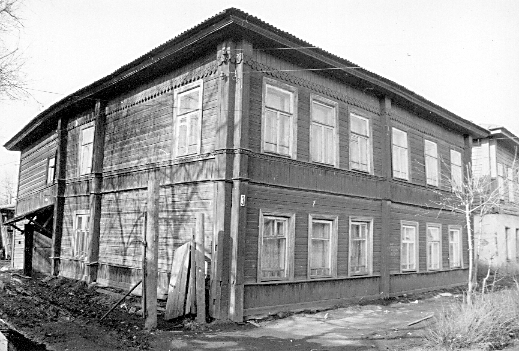 Двухэтажный деревянный дом со скромным резным декором типичен для рядовой жилой застройки своего времени. Прямоугольное в плане здание под вальмовой кровлей рублено из бревен в обло и обшито тесом. Выпуски хвостов бревен на углах и в перерубах — один по центру главного фасада и два, выделяющих продольный коридор, на боковых — зашиты досками, имитирующими лопатки. Под прямоугольными окнами обоих этажей, заключенными в простые профилированные рамки, проходят широкие подоконные пояса из вертикально положенной обшивки. Строгость фасада несколько нарушает пропильная накладная резьба, узкой полосой подчеркивающая линию подоконников верхних окон и оформляющая низ широкого фриза под профилированым карнизом большого выноса. Внутри продольный коридор делит каждый из этажей на ряд жилых помещений, сгруппированных вдоль уличного и дворового фасадов. Лит. и ист.: Памятники архитектуры Костромской области. Вып. 3. Кострома, 2001. С. 74.