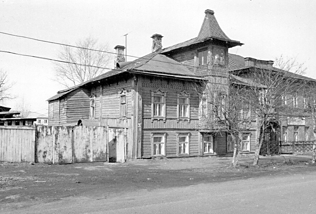 Дом жилой Богомолова, нач. XX в.Адрес Объем дома, в плане близкий квадрату, усложнен выступом лестничной клетки в дальней части бокового южного фасада. Оригинален облик небольшого мезонина, прорезающего вальмовую кровлю: он имеет вид башенки-фонарика, устроенной над эркером второго этажа и завершенной шатровой кровлей с вогнутыми гранями. Выпуски бревен на углах объема прикрыты досками, имитирующими лопатки, и украшены накладной резьбой. Под окнами второго этажа проходит широкий пояс из вертикально положенных досок обшивки. Из вертикального теса с узорными нижними концами сделан также фриз под широким карнизом, опирающимся на фигурные кронштейны. Окна первого этажа заключены в строгие наличники с профилированными сандриками. Наличники верхних окон более нарядны, с фигурными фартуками и щипцовыми подвышениями очелий (в 2000-х гг. отдельные проемы получили современные заполнения с расстекловкой, не соответствующей исторической). Главное окно башенки сохранило первоначальную раму с мелкой фигурной расстекловкой. Лит. и ист.: Памятники архитектуры Костромской области. Вып. 3. Кострома, 2001. С. 84. Персоны