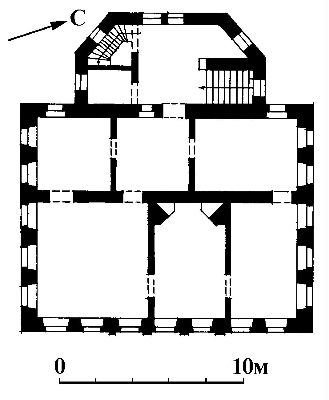 Усадьба Каликиных, 1-я четв. XIX в., кон. XIX в.Адрес Двухэтажный кирпичный оштукатуренный жилой дом принадлежит к лучшим образцам галичской архитектуры классицизма. Прямоугольный в плане объем под вальмовой кровлей дополнен со двора крупным пятигранным выступом сеней в три этажа, между ним и юго-западным углом дома расположена одноэтажная квадратная в плане палатка под односкатной кровлей. Главный фасад отличается симметричной представительной композицией в семь осей окон. Три средних оси выделены четырьмя коринфскими пилястрами колоссального ордера. Над этой частью фасада возвышается небольшой мезонин. Этажи разделены двумя полочками, между которыми по осям окон помещены ниши: ромбовидные в средней части и фигурные на флангах фасада. Все окна прямоугольные, без наличников. Венчающий карниз профилирован и раскрепован над пилястрами. Мезонин, завершенный треугольным фронтоном и фланкированный волютами, прорезан тремя окнами — арочным, более высоким в центре и узким прямоугольным по бокам. Боковые фасады в пять осей окон имеют аналогичные главному фасаду горизонтальные членения. Их средние части в три оси акцентированы слегка выступающими ризалитами. К редким в настоящее время первоначальным элементам архитектуры относятся расположенные на вальмах крыши деревянные слуховые окна с арочными проемами и треугольными фронтонами. Задний фасад отличается необычно развитым архитектурным решением. Выступающие здесь сени богато декорированы. Первый этаж (вероятно, первоначальный) обработан рустованными пилястрами. Два верхних этажа расчленены арками, нишами, филенчатыми лопатками, поясом бегунца и т.д. Фасады палатки лишены декора. На первом этаже основные помещения группируются по сторонам небольшой прихожей, сообщающейся с сенями. На втором этаже планировка — анфиладного типа. Комнаты с окнами на улицу образуют парадную анфиладу, состоящую из углового квадратного зала и двух одинаковых по размерам прямоугольных в плане помещений — центральной гостиной с двумя угловыми печами и спальни. Три комнаты задней части дома также объединены по принципу анфилады. В сенях расположены широкая одномаршевая лестница с первого на второй этаж и узкая с забежными ступенями лестница со второго этажа в мезонин. Помещение палатки перекрыто коробовым сводом. Двухэтажный кирпичный фабричный корпус — уникальный для Галича образец промышленного сооружения, входящего в состав городской усадьбы. Прямоугольный в плане объем завершен двускатной кровлей. Фасады здания сильно переделаны. Первоначальный характер сохранил только западный фасад. Его стену расчленяют лопатки и междуэтажный карниз. Окна с лучковыми перемычками (на первом этаже растесаны и сделаны прямоугольными) оформлены рамочными наличниками. На фланге фасада выделяется ризалит с входным проемом и расположенным над ним крупным арочным окном. В декоре использован мотив аркатурного пояса, примененный над окнами первого этажа на фланге фасада и под венчающим карнизом в средней части. Лит. и ист.: Тиц А.А. На земле древнего Галича. М., 1971. С. 36; Белов Л. Улица Луначарского // Ленинский путь. Галич. 1979. 7 августа; Памятники архитектуры Костромской области. Вып. 3. Кострома, 2001. С. 95-96. Персоны