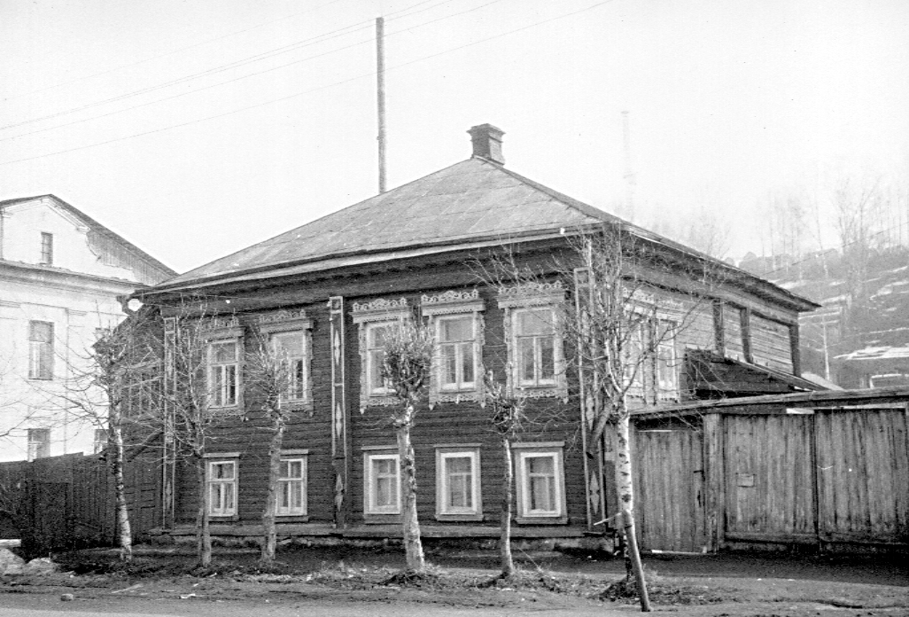 Один из характерных типов деревянной застройки Галича периода эклектики — дом-пятистенок с резным убранством фасадов в духе народного зодчества. Стены рублены с остатком и обшиты тесом. Прямоугольный в плане объем под вальмовой кровлей дополнен сбоку более низкими сенями на всю длину дома. Главный фасад делится выступом переруба на две неравные части — в две и три оси окон. Окна первого этажа невысокие, до недавнего времени были обрамлены простыми наличниками. На втором этаже окна украшены пропильной резьбой, особенно нарядной над прямыми сандриками. В 2000-х гг. окна первого этажа и частично второго получили современные оконные заполнения с расстекловкой, не соответствующей исторической, при этом окна первого этажа утратили первоначальные наличники. Выступы переруба и угловых венцов оформлены филенчатыми лопатками с копьевидными накладными элементами. Профилированный на кованых гвоздях венчающий карниз с мутулами выполнен в традициях позднего классицизма. В декоре бокового (южного) и заднего фасадов использованы те же мотивы, что и на главном фасаде. Лит. и ист.: Памятники архитектуры Костромской области. Вып. 3. Кострома, 2001. С. 97.