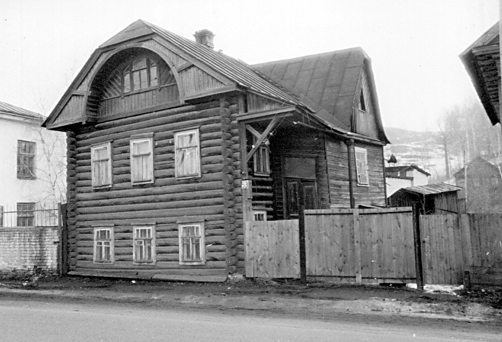 Один из немногих образцов деревянной архитектуры Галича, в котором отразилось влияние стиля модерн. Рубленные с остатком стены в своей основной части не обшиты тесом. Г-образный объем двухэтажного дома завершен двумя взаимно перпендикулярными двускатными кровлями с небольшими вальмами на торцах. Главный фасад в три оси окон симметричен по композиции. По контрасту с лишенной декора основной плоскостью фасада его необычное завершение выглядит особенно выразительно. Выступающий фронтон прорезан крупной аркой, в которую заглублено трехчастное арочное окно чердака. На боковом фасаде кровля основного объема продолжена вниз таким образом, что она образует навес перед входом, ведущим в сени. Навес поддерживается кронштейном в виде треугольника со стрелой, расположенным в одной плоскости с главным фасадом. Во входе — двустворчатая филенчатая дверь. Лит. и ист.: Памятники архитектуры Костромской области. Вып. 3. Кострома, 2001. С. 102.