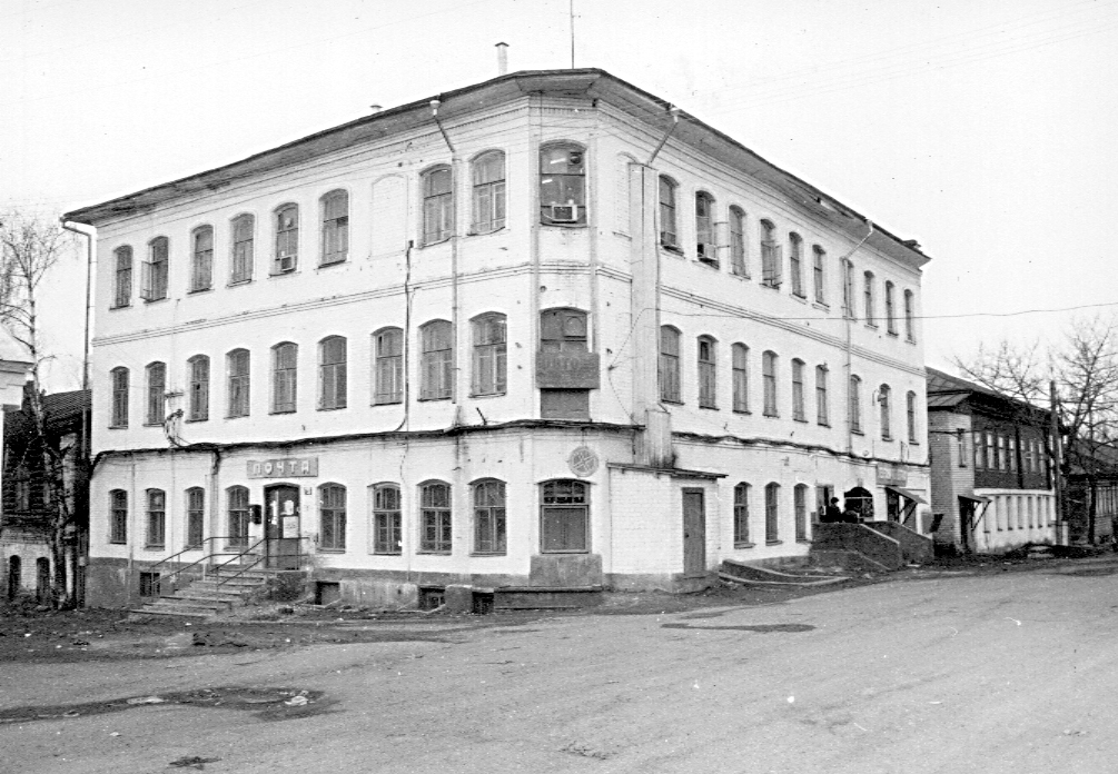 Одно из крупнейших зданий Галича, занимает ответственное градостроительное положение, закрепляя угол квартала в центре города. Выстроено в период эклектики, сохраняет отдельные приемы и формы, тяготеющие к традициям позднего классицизма. Северный фасад выходит на красную линию улицы, восточный — на пл. Революции. Трехэтажное с подвалом здание кирпичное, стены покрыты обмазкой. Г-образный объем со скругленным и раскрепованным внешним углом завершен двускатной кровлей с вальмой над южным торцом. Фасады, обращенные к улице и площади, отличаются едиными приемами композиции и декора. Стену по вертикали четко разделяют междуэтажные карнизы в форме ступенчатых полочек. Довольно часто расположенные окна на всех этажах имеют лучковые перемычки, но только на третьем этаже они обрамлены простыми наличниками. Со стороны площади равномерный ритм проемов нарушают проездная арка с лучковой перемычкой и широкое прямоугольное окно-витрина. По верху стен проходят пояс поребрика и деревянный профилированный венчающий карниз большого выноса (крепится коваными гвоздями). На скругленном углу на втором этаже некогда располагался балкон. Глухой западный торец (существующие окна новые) завершается щипцовым аттиком с заплечиками. Лит. и ист.: Памятники архитектуры Костромской области. Вып. 3. Кострома, 2001. С. 117-118.