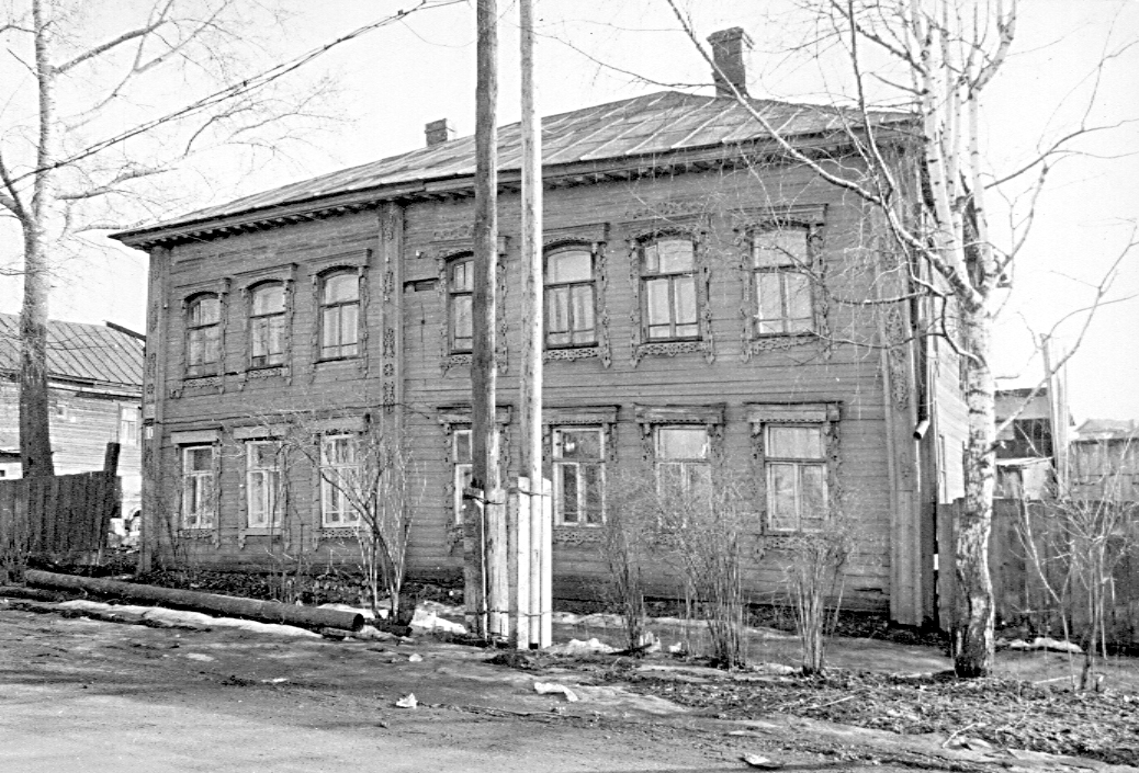 Один из характерных для Галича типов двухэтажного деревянного дома периода эклектики с резным убранством фасадов. Рубленные с остатком стены обшиты тесом. Прямоугольный в плане объем под вальмовой кровлей вытянут вдоль улицы. Со двора к нему примыкает выступ ретирады. Главный фасад в семь осей окон делится лопаткой, отвечающей внутреннему перерубу, на две неравные части (в три и четыре оси). Такие же лопатки прикрывают выступы угловых венцов. Филенки лопаток украшены накладным орнаментом, включающим круглые розетки. Окна первого этажа (прямоугольные) и второго этажа (с лучковыми перемычками) обрамлены резными наличниками, увенчанными профилированными сандриками с ажурными завершениями. Венчающий карниз, в отличие от остального декора, тяготеет к традиционным формам классицизма. Он профилирован и дополнен мутулами. Лит. и ист.: Памятники архитектуры Костромской области. Вып. 3. Кострома, 2001. С. 120.