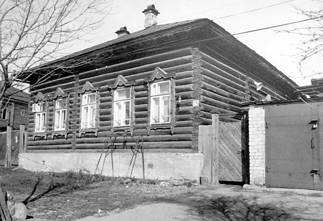Рубленный «в лапу» одноэтажный дом-пятистенок на кирпичном цоколе характерен для деревянной застройки Галича периода эклектики. Прямоугольный в плане объем с вальмовой кровлей вытянут в глубину владения. Задний торец дома закрывают сени советского времени. Главный фасад в пять окон симметричен по композиции. Прямоугольные проемы обрамлены наличниками с резными накладными столбиками и завершены щипцовыми сандриками на фигурных кронштейнах. Сандрики украшены пропильным орнаментом и зубчатыми подзорами. Профилированный венчающий карниз с мутулами и розетками характерен для архитектуры позднего классицизма — возможно, он перенесен с другого дома. Лит. и ист.: Памятники архитектуры Костромской области. Вып. 3. Кострома, 2001. С. 139.