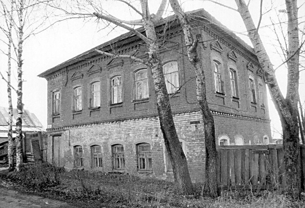 Двухэтажный кирпичный дом свидетельствует о стойкости традиций классицизма в жилой застройке Галича. Первоначальный объем в пять оконных осей вдоль уличного фасада был позже расширен к югу на одну ось — здесь поместилась лестничная клетка с главным входом в здание. Прямоугольный в плане объем, завершенный вальмовой кровлей, вытянут вдоль улицы. Между собой этажи разделены кирпичной полочкой с сухариками. Фасады завершены карнизом с двухступенчатыми консольками и деревянной выносной плитой с мутулами; по краю кровли проходит узкий резной подзор. Границы первоначального объема отмечают ступенчатые языки, спускающиеся от венчающего карниза. Равномерно расставленные окна с лучковыми перемычками частично сохранили штукатурные наличники в виде узких профилированных рамок. Верхние проемы отмечены высоко поднятыми треугольными сандриками и лежачими подоконными нишками. Лит. и ист.: Памятники архитектуры Костромской области. Вып. 3. Кострома, 2001. С. 46-47.