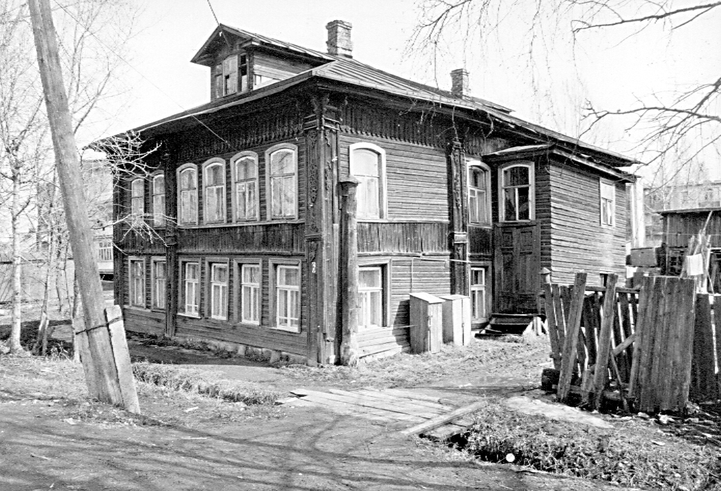 Дом жилой, нач. XX в.Адрес Поэтажная структура фасадов выявлена широкими полосами вертикально положенного теса, образующими междуэтажный пояс и фриз под кровлей — последний украшен пропильным узором. Углы объема и места перерубов фиксированы филенчатыми лопатками, декорированными накладной резьбой. Роль капителей в них выполняют сдвоенные фигурные кронштейны, поддерживающие выносную плиту венчающего карниза. Одна из таких лопаток делит главный фасад на два прясла — в две и четыре оси. Окна, прямоугольные в первом этаже и с лучковыми перемычками во втором заключены в строгие профилированные рамочные наличники. Лит. и ист.: Памятники архитектуры Костромской области. Вып. 3. Кострома, 2001. С. 112. Данные государственной охраны