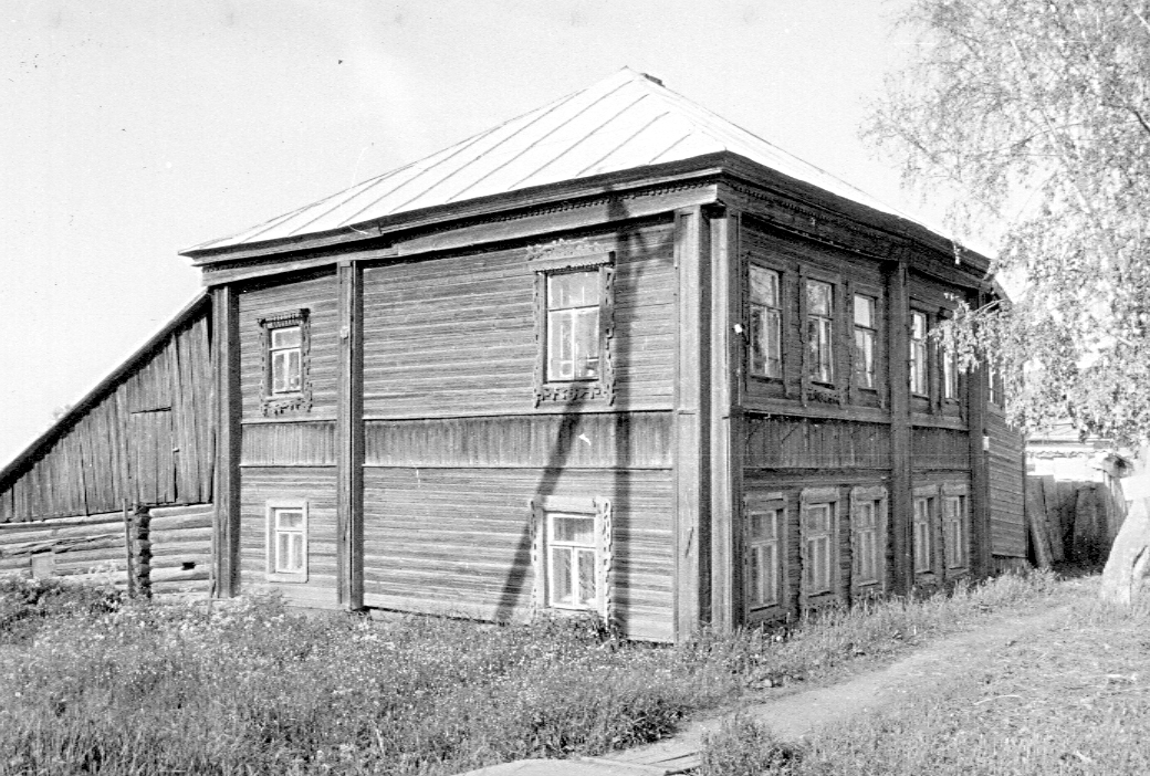 Дом жилой, кон. XIX в.Адрес Оформление фасадов, по сравнению с аналогичными зданиями города, характеризуется сдержанной трактовкой декоративных форм. Наиболее разработанным элементом декора являются ажурные резные оконные наличники с полочками и навершиями (на большинстве окон последние утрачены). Стены по периметру объема завершены слабо профилированным карнизом с нешироким фризом, украшенным поясом мелких сухариков. На уличном и боковых фасадах в уровне междуэтажного членения укреплены тонкие профилированные рейки, между которыми обшивка уложена вертикально. Обшивка выступающих хвостов венцов сруба, имитирующая филенчатые пилястры, декорирована лишь гладкими ромбиками. Лит. и ист.: Памятники архитектуры Костромской области. Вып. 3. Кострома, 2001. С. 186-187. Данные государственной охраны
