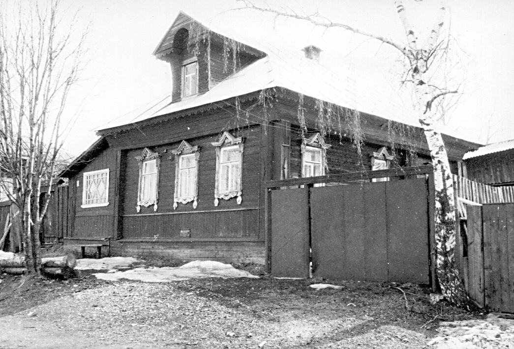 Дом жилой, кон. XIX в., 1-я пол. XX в.Адрес Дом — прямоугольный в плане пятистенок, рубленный с остатком и обшитый гладким тесом, — обращен к улице торцовым фасадом. Покрыт четырехскатной вальмовой крышей. Уличный фасад в три окна акцентирован крупным чердачным окном; боковые фасады несимметрично разделены перерубом внутренней стены. Цоколь дома отделен отливом-полочкой, выше которого, под подоконниками окон, обшивка уложена вертикально. Стены завершаются широким подшивным повалом, а свесы кровли украшены несложным пропильным подзором. На обшивке выступающих хвостов бревен укреплены накладные «стрелки». Нависающий треугольный щипец двускатного покрытия чердачного окна усложнен полукруглой нишей. Форма резных наличников прямоугольных окон со щипцовыми навершиями и небольшими ушами представляет собой позднюю реплику широко распространенного в предшествующее время оконного обрамления. Лит. и ист.: Памятники архитектуры Костромской области. Вып. 3. Кострома, 2001. С. 197. Данные государственной охраны