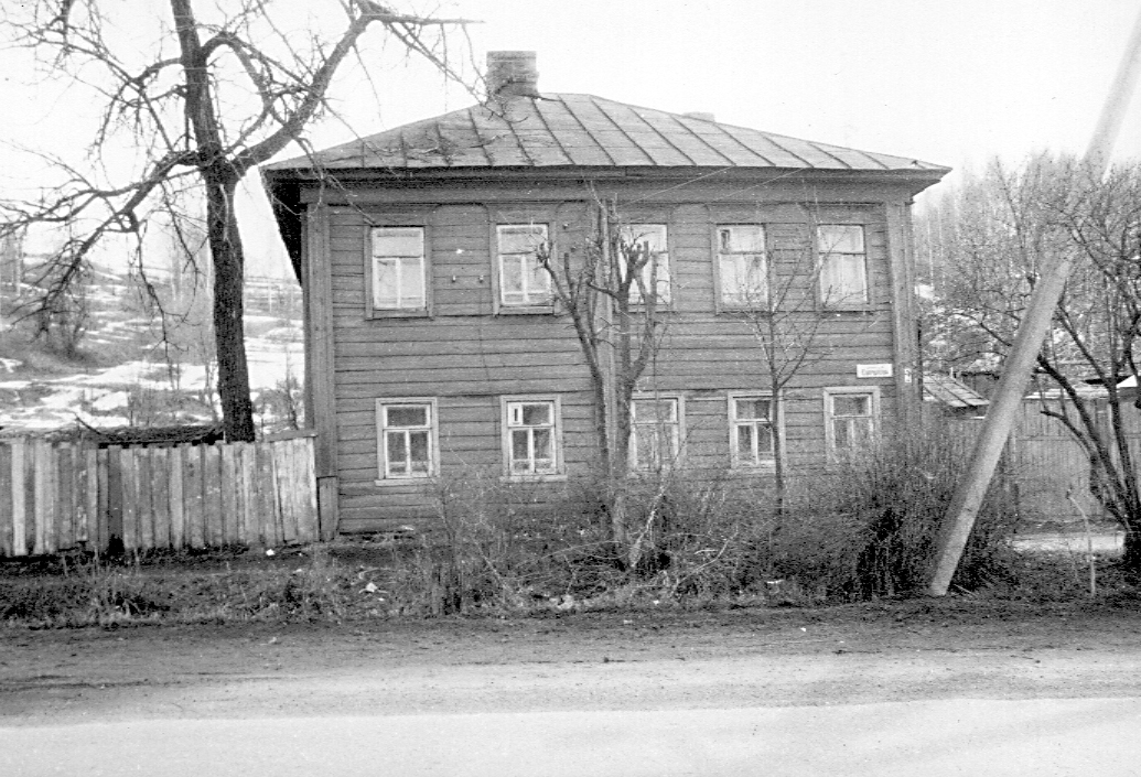 Двухэтажный деревянный жилой дом с позднеклассицистическим декором характеризует рядовую застройку Галича кон. XIX в. Рублен из бревен, перевязанных в обло, и обшит снаружи старым калеванным тесом, укрепленным коваными гвоздями. Объем, в плане близкий к квадрату, конструктивно представляет собой крестовик, покрытый четырехскатной стропильной крышей. Уличный фасад здания, разделенный перерубом внутренней стены, решен в пять оконных осей, причем, в отличие от подавляющего большинства подобных деревянных домов Галича, оконные проемы размещены равномерно. От первоначального декора сохранились лишь рамочные наличники на окнах второго этажа с навершиями-сандриками. Обрамления окон первого этажа, венчающий карниз и обшивка выступающих хвостов венцов сруба заменены в советское время. Со стороны левого бокового фасада перед входом сооружен поздний двухэтажный тамбур. Со стороны дворового фасада, видимо, примыкали хозяйственные постройки. Лит. и ист.: Памятники архитектуры Костромской области. Вып. 3. Кострома, 2001. С. 210.