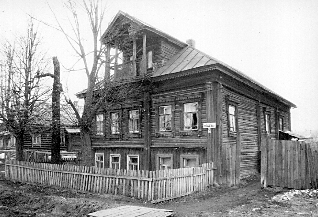 Характерный для сельской застройки своего времени одноэтажный на высоком подклете дом с эклектичным декором рублен из бревен, перевязанных в обло, и обшит снаружи тесом. Прямоугольный в плане объем, покрытый трехскатной стропильной крышей, состоит из передней жилой части и поперечных сеней, к которым примыкал хозяйственный двор. Среди аналогичных домов Шокши выделяется наличием на уличном фасаде небольшого тесового мезонина с балконом. Фасад, несимметрично разделенный перерубом внутренней стены, имеет пять оконных осей, сгруппированных по два и по три. Окна подклета прорублены в советское время при приспособлении его под жилье. На уличном и боковых фасадах стены завершены карнизом с гладким фризом и свисающим подзором несложной пропильной резьбы. Такими же подзорами украшены полочки рамочных с «ушами» наличников на прямоугольных окнах. Обшивка выступающих хвостов венцов сруба имитирует гладкие пилястры с упрощенными капителями. Треугольный навес балкона, сохранившего ограждение из плоского балясника, поддерживают четыре столбика. Планировка жилой части дома состоит из четырех различных по площади комнат. Лит. и ист.: Памятники архитектуры Костромской области. Вып. 3. Кострома, 2001. С. 236-237.
