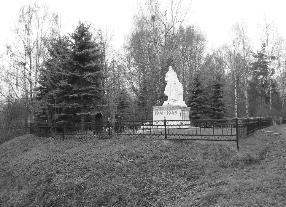 Братские могилы воинов, умерших от ран в госпиталях в годы Великой Отечественной войны, 1941-1945 гг.Вымощенная плиткой видовая площадка, на которой находится мемориал, расположена на невысоком холме. Она обнесена металлической оградой, включающей в себя памятник воинам и могилы Героев Советского Союза В.М. Ляполова и А.Н. Суслова. Центром мемориала являются две аллегорические фигуры, установленные на высокий, протяженный постамент, — стоящий с автоматом за плечами Воин и скорбящая Мать-Родина, сидящая в полуобороте к нему. Скульптура слегка смещена от центра постамента и поднята на невысокое ступенчатое основание, у его подножия размещена бетонная пятиконечная звезда с Вечным огнем. В постамент с трех сторон вмонтированы мраморные плиты с именами захороненных воинов. На лицевой стороне постамента крупные цифры «1941 – 1945». По сторонам постамента две цементные вазы с цветами. Лит. и ист.: Праздничные торжества в городе // Ленинский путь. Галич, 1958. 26 февраля; Лапин Н. О памятниках истории и культуры Галича // Ленинский путь. Галич, 1971. 18 декабря. Персоны