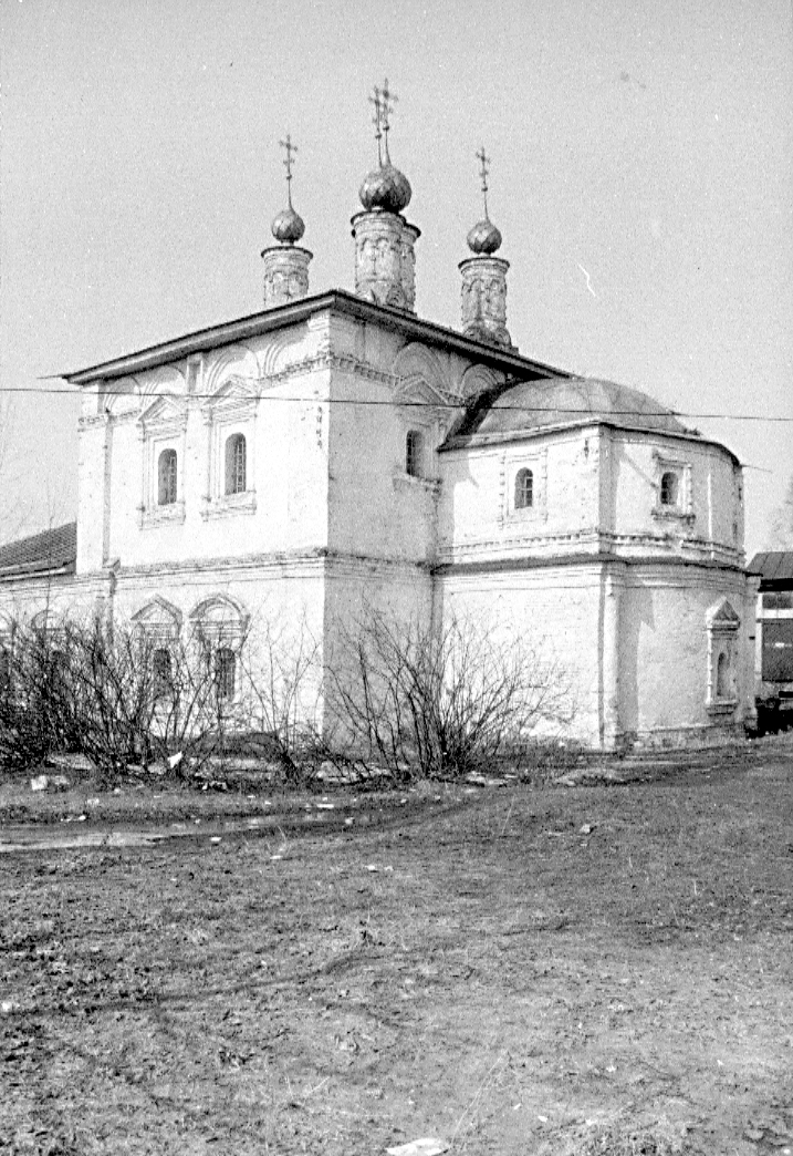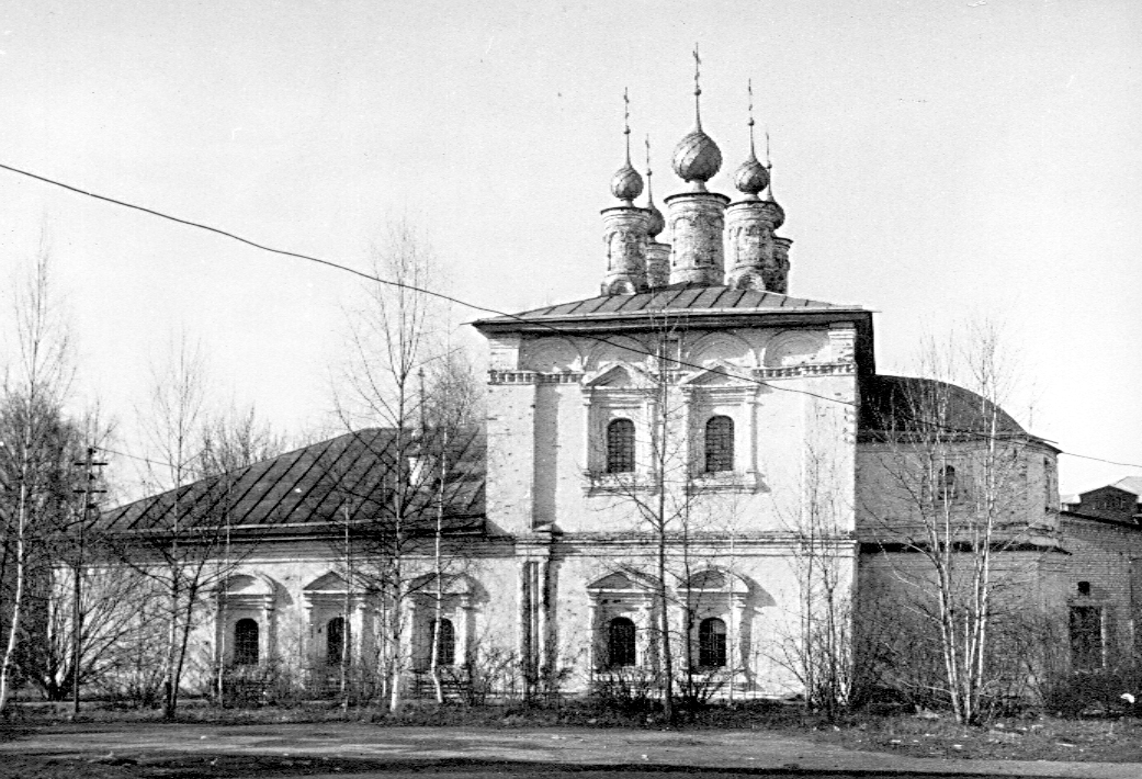 Церковь Богоявления. Комплекс, кон. XVII в., сер. XIX в., кон. XIX - нач. XX в.Адрес В одних литературных источниках XIX — нач. XX в. упоминается о существовании здесь в XVIII в. мужского монастыря, в других — женского с богадельней. Существующее здание женской богадельни, стоящее в линии ограды с южной стороны церковной территории, было построено на средства галичского купца 2-ой гильдии М.А. Редькина в 1839-1842 гг., но открыта богадельня была только в 1855 г. Ее попечителем был назначен галичский купец 1-й гильдии П.Г. Вакорин. В угловой юго-восточной части здания была устроена церковная лавка. Сторожка, расположенная в линии ограды, с северо-западной стороны от церкви, сооружена в кон. XIX — нач. XX в. В 1930-е гг. сломаны холодная церковь и колокольня. В тот же период значительные искажения претерпела архитектура теплой церкви, но при реставрации КСНРПМ в 1970-1980-х гг. (архит. В.С. Шапошников) ей был в основном возвращен первоначальный облик: восстановлено пятиглавие, выложены проемы и воссоздан декор нижнего яруса. Проведенные в 2008 г. специалистами ОГУ «Наследие» натурные исследования Богоявленской церкви, а также археологические раскопки под руководством А.Г. Авдеева позволили сделать предположение, что первоначально храм имел несколько иной вид: вдоль северной стены храма размещалась одноэтажная галерея, к ней примыкала апсида, выходившая за грань стены четверика, а на второй этаж храма вела каменная наружная лестница (во время раскопок были вскрыты фундаменты северной апсиды, галереи и часть фундаментов каменного крыльца). Кирпичная оштукатуренная теплая церковь по своим архитектурным формам характерна для приходских посадских храмов кон. XVII в., но отличается необычной структурой внутреннего пространства. Ядром продольно-осевой композиции является поперечно вытянутый (по оси север-юг) двухэтажный четверик, завершенный небольшим пятиглавием. Цилиндрические глухие барабаны (центральный несколько крупнее угловых) увенчаны луковичными главками. Прямоугольная в плане двухэтажная апсида с востока имеет полукруглый выступ. Одноэтажная трапезная, ширина которой равна длине четверика, завершена вальмовой кровлей с двумя небольшими главами над придельными алтарями. Четверик храма только на южном фасаде сохранил первоначальный облик (частично воссоздан при реставрации). Композиция в две оси окон имеет уравновешенный характер и в целом отличается четкими вертикальными и горизонтальными членениями. Углы фасада закреплены широкими лопатками, стена разделена междуэтажным профилированным карнизом. Отсутствие западной лопатки на первом этаже сообщает композиции асимметричный акцент, который усиливают сдвинутые к центру сдвоенные полуколонки с выпущенным между ними углом. Арочные окна обоих этажей обрамлены колончатыми наличниками с сандриками. На первом этаже один из проемов увенчан треугольным сандриком, другой — лучковым. Оба верхних окна имеют треугольные сандрики, которые прерывают поребрик и врезаются в полукруглые кокошники, завершающие плоскость стены. Аналогичные пояса кокошников и поребрика расположены на всех фасадах четверика. На северном фасаде остальной декор срублен, окна первого этажа растесаны. На втором этаже находится два арочных проема (к одному из них — входу в верхнее помещение храма — ведет деревянная наружная лестни