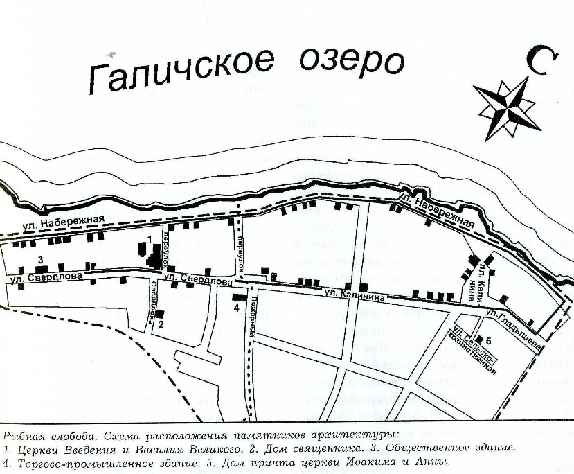 Рыбная слобода. Схема расположения памятников истории и культуры1. Церкви Введения и Василия Великого. 2. Дом священника. 3. Общественное здание. 4. Торгово-промышленное здание. 5. Дом причта церкви Иоакима и Анны |