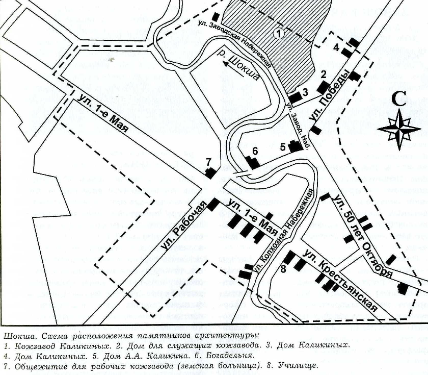 Шокша. Схема расположения памятников истории и культуры1. Кожзавод Каликиных. 2. Дом для служащих кожзавода. 3. Дом Каликиных. 4. Дом Каликиных. 5. Дом А.А. Каликина. 6. Богадельня. 7. Общежитие для рабочих кожзавода (земская больница). 8. Училище. |